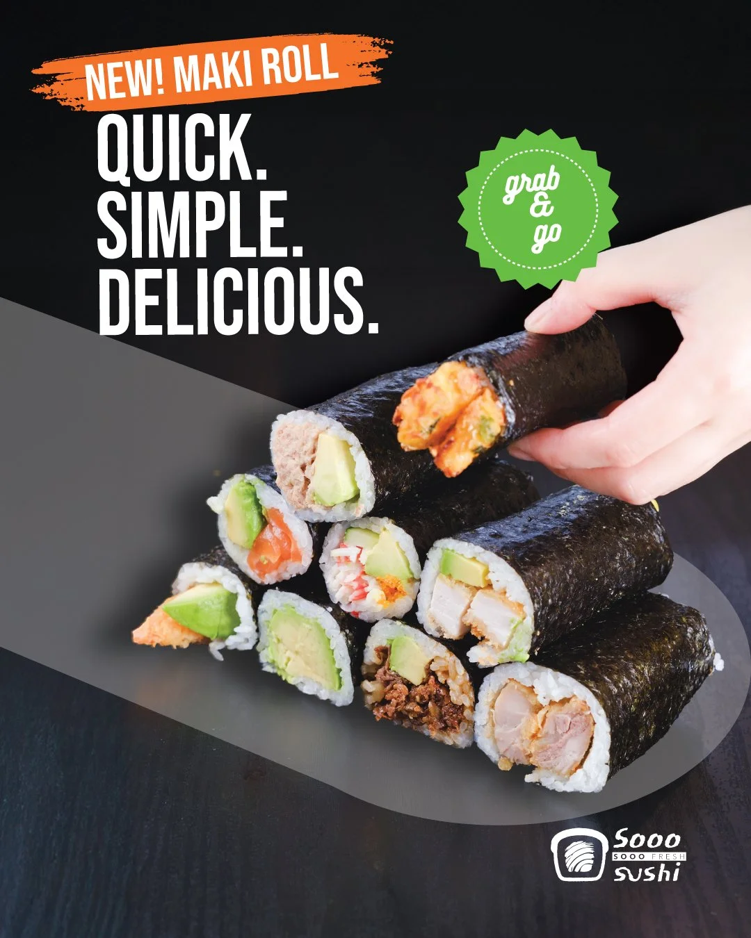 Discover our New Maki Rolls at SOOO Sushi —9 different varieties, freshly made and ready to enjoy. Perfect for when you want something tasty, fast, and easy.No waiting, just great flavour.Sushi that makes you say Sooo Good